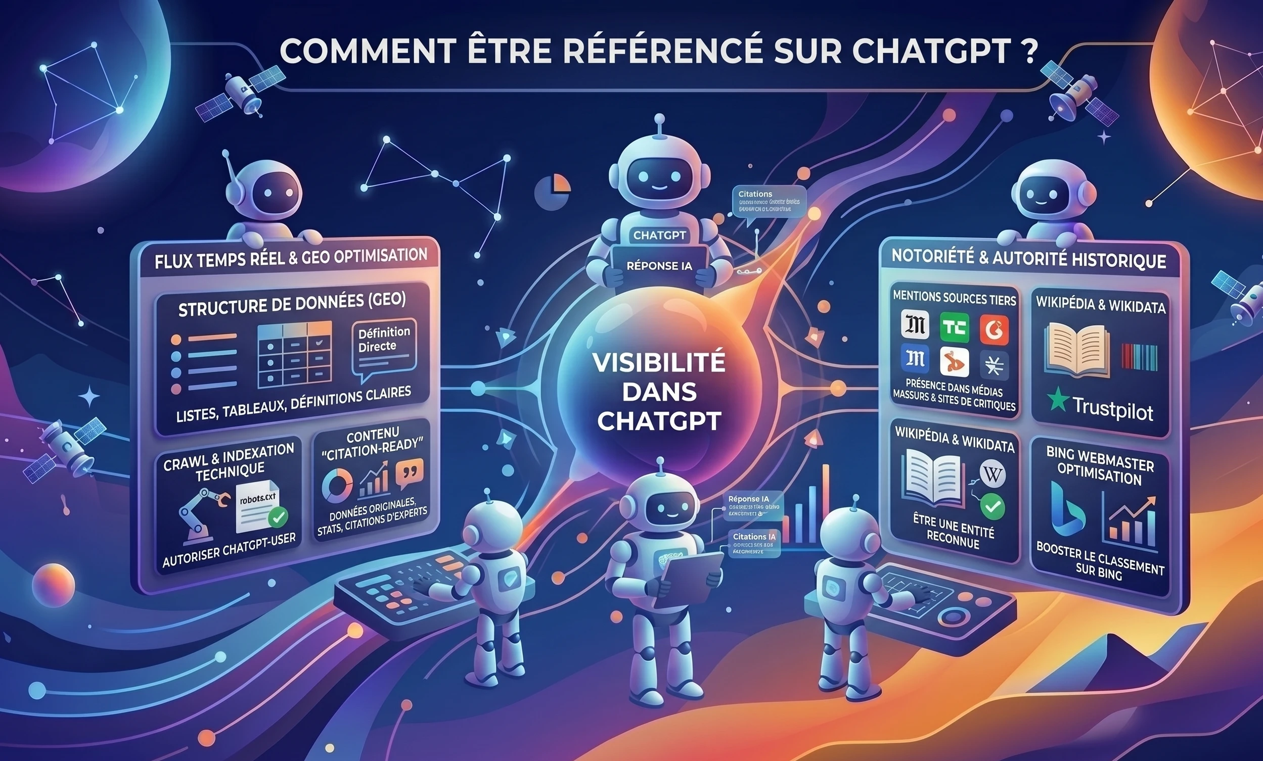 | Environnement | SERP classiques Google / Bing | ChatGPT, Perplexity, Gemini, Copilot, AI Overviews |
